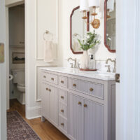 Further, this double clove sconce is stunning in person, it elevates the bathroom, and it’s the perfect size too for the more narrow space between our double mirrors over our 60 inch bathroom vanity.